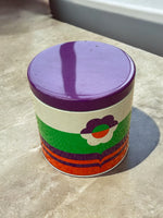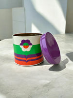 Boite ronde en métal décor fleur, offerte par la colle Scotch à l’époque. Années 70.