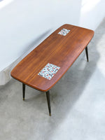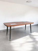 Une merveille à l’état pur. Magnifique table en teck qui date des années 50/60, détails mosaïques. Pieds compas noirs chaussés de laiton. Très bel état pour son grand âge.