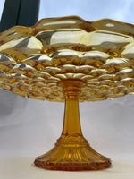 Plat à gâteau Art déco en verre pressé ambre, Belgique, années 1930. Élégant exemple de verre de dépression, au style raffiné et intemporel.