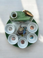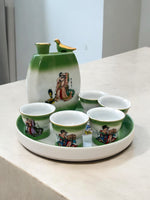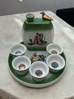 Service à saké en céramique comprenant un plateau et 5 verres à loupe peintes de reproduction de femmes et d’hommes dénudés.