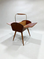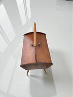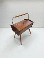 Voici une sublime boîte à couture / travailleuse des années 60 avec ses pieds compas iconiques et son bois chaleureux.