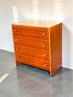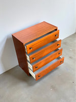 Quatre tiroirs bien rangés, du bois chaud qui capte la lumière, structure en contre plaqué de qualité et ces petites poignées en laiton qui font tout le job ✨