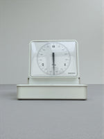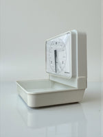 Balance de cuisine vintage des années 70, toute blanche et signée Soehnle, le pro allemand du pesage stylé. Elle se fixe au mur. Quand tu ne t’en sers pas, clac, son couvercle se referme comme si elle passait en mode veille.