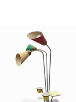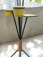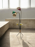 Voici une incroyable lampe sur pied des années 50, un vrai bijou rétro avec non pas un, mais deux porte-plantes et un petit plateau intégré. Un vrai petit meuble multifonction façon mid-century !