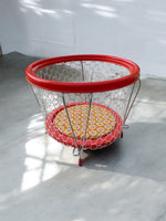 Parc pour poupées ancien des années 70 de forme ronde. Pieds et tour métal, fond carton enduit vinyle on ne peut plus seventies, filet maille nylon.