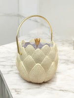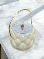 Seau à glace artichaut de Hans Turnwald pour Freddotherm Suisse. Forme d’artichaut de couleur crème, couvercle en plexiglas, poignée en laiton. Années 1960. En bon état. H25(poignée comprise)/, 5(poignée exclue) cm, diamètre 16 cm.