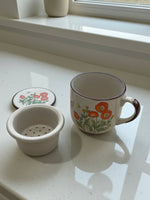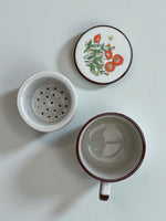 Jolie tisanière composée d’une tasse, d’un filtre et d’un couvercle, entièrement en grès.